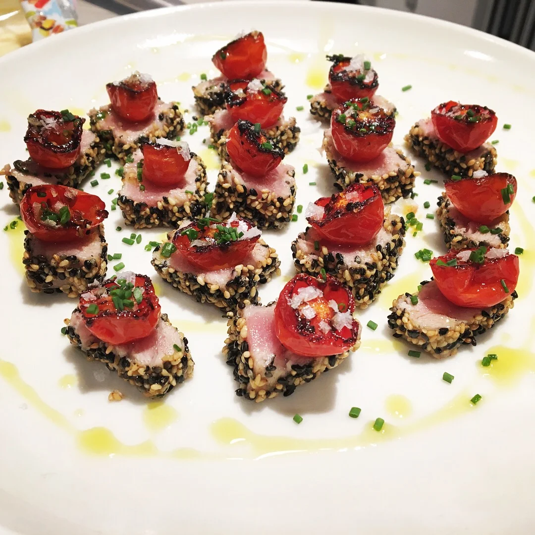 Time to get a little bolder - sesame-crusted seared tuna belly with (purposely) burnt tomatoes, balsamic cream, oregano oil, and Maldon salt. This was kind of a play on Sicilian-style tuna.