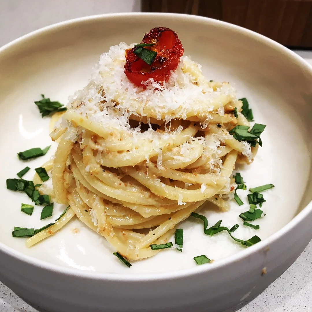 First main course - bucatini in a matsutake and chantrelle cream sauce with parmesan, basil, and another one of our burnt tomato friends just for fun.